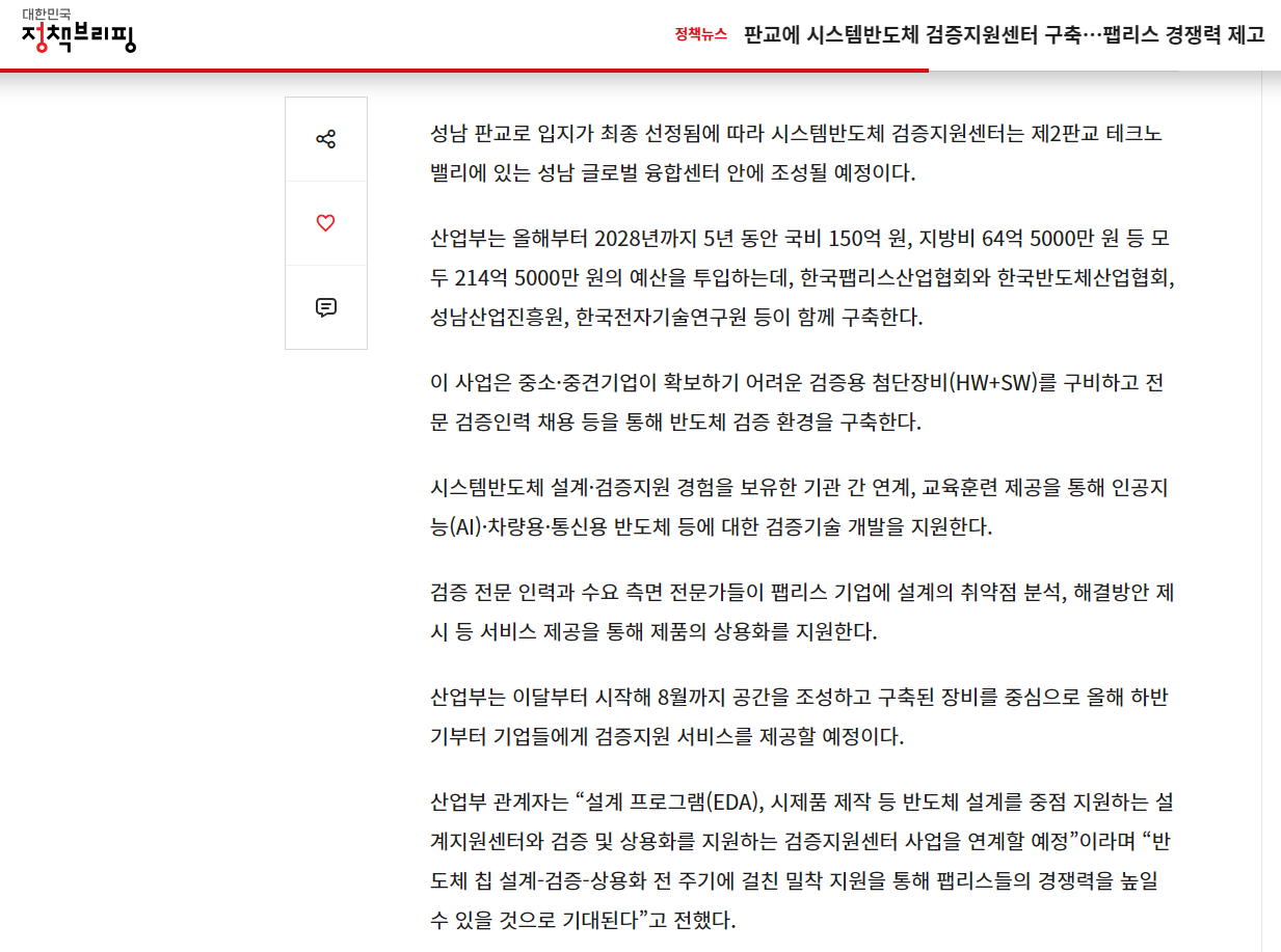 - 칩 설계-검증-상용화 전 주기에 걸친 밀착 지원을 통해 팹리스 경쟁력 제고 기대