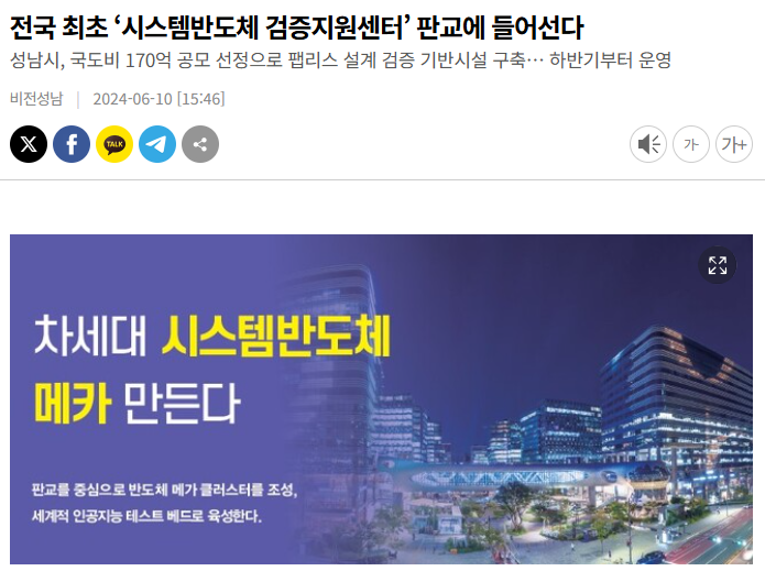 출처 : 성남시 시정소식지, “전국 최초 ‘시스템반도체 검증지원센터’ 판교에 들어선다”, 2024년 6월 10일, https://m.snvision.newsa.kr/a.html?uid=19182