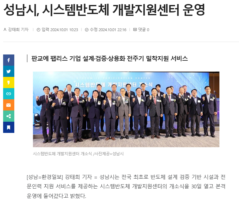 출처 : 환경일보, “성남시, 시스템반도체 개발지원센터 운영”, 2024년 10월 01일, https://www.hkbs.co.kr/news/articleView.html?idxno=772951